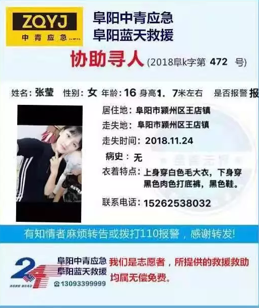 11月24日走失一名16岁女孩11月29日又走失一名15岁女孩至今没有消息紧急寻人希望各位朋友能够扩散出去如果没线索,也请多尽一份心让身边亲朋好友留意下希望孩子早点平安回家早日与家人团聚张莹,16岁,